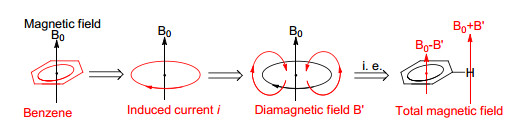 以苯分子为例(图 2), 由于其良好的环内电子离域性, 在外加磁场B0下相当于一根环形的导线, 会产生分子环电流i, 从而产生感应磁场B'.根据物理学楞次定律, B'在环内具有抵抗外界磁场的方向, 在环外有和外界磁场一致的方向.因此, 这样的分子环电流i也被称为“抗磁环电流”.不难理解, 由于这样的抗磁性质, 苯环的外侧会产生去屏蔽区域, 表观磁场将增大为(B0+B'), 而内侧则是去屏蔽区域, 表观磁场将减小至(B0-B')(此处B'仅仅指代一个正值, 并非内外增减的数值完全相等).