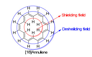芳香化合物产生的独特抗磁环电流, 会导致周围的磁场环境发生变化.例如苯分子的6个H原子均处于抗磁环电流的去屏蔽区域(图 2), 因此其1H NMR的化学位移值会向低场移动(δ 7.3, 环己烯的sp2碳原子所连的H原子δ 5.6). Pople也通过一些理论计算, 研究了苯环不同的化学位移[13].而更显著的例子是[18]轮烯(图 3), 其含有6个向环内的H原子处在上述的屏蔽区域, 另外12个H原子则处于外侧的去屏蔽区.其环内H原子的1H NMR化学位移值明显向高场偏移(δ-3.0), 而环外H原子则明显向低场移动(δ+9.2)[40, 41].