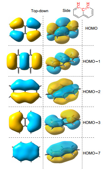 当体系中全充满的π分子轨道为(2n+1)个时, π电子数即为(4n+2)个, 则判断该化合物为芳香性化合物.使用现代可视化的分子轨道方法, 除了可以计算π电子数, 还可以分析体系的离域性质.以萘环为例(图 4), 通过分子轨道理论的理解以及直观图像的观察, 可知萘分子的π体系为一个整体, 应当按照整体计算, 具有5个π-MOs, 佐证其为10电子体系.该结构中所有分子轨道的节点数目均为偶数, 具有典型的Hückel芳香性.