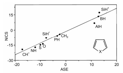 Schleyer等[22]还对NICS(0)和ASE的大小关系进行比较, 发现具有较好的线性关系.如图 6所示, 环戊二烯中性分子的NICS(0)接近于零, 而环戊二烯负离子则具有较负的NICS(0)(其值为-14.3).按NICS(0)值判断, 吡咯、噻吩、呋喃等都是芳香性化合物, 而硼杂环戊二烯、铝杂环戊二烯、硅杂环戊二烯正离子等都是反芳香化合物, 这与经典的归类方式相符.