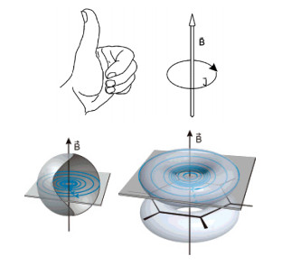 Figure 7 "Left-hand rule" (up); a local current density of hydrogen atom and a delocalized one of benzene (down)