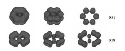 在MO理论中, 分子的电子云是分散在体系, 其电子离域性越好, 电子分散程度就越大.类似于山川的等高线, 如在三维环境中对电子云密度选取等值面, 选取的值不同, 则面的囊括范围也不同. ELF就是基于此原理发展的判据方法.以苯为例, 当ELF等值面的值(isovalue)越大, 其等值面内的空间就越小(图 9)[74], 随着值的增大, 各个碳原子之间的离域空间就会被断开, 变为每个碳相对独立的电子云区域.处于刚好断开的临界值被称为ELF值, 如苯的ELF为0.91, 萘为0.78(图 9).对于类似体系, ELF值越大, 反映电子在改ELF值区域内离域程度越好.