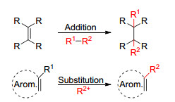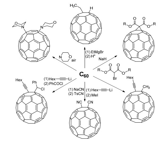 这一判据也存在一些例外, 例如C60等富勒烯分子(fullerenes)很容易发生各种加成反应(Scheme 3), 而其取代反应却相对困难.这可能是因为其存在一定的球面张力, 导致其反应性质与常规的不饱和体系类似[37~39].