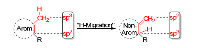 这种方法是Schleyer等[62]在2002年建议使用的, 其相当于单分子的等键反应.与此前的等键反应的唯一区别是, 不需要引入一个新的分子, 而是直接在考察的体系上引入一个甲基取代基或借助体系中已有的甲基取代基(Scheme 4), 然后进行“H-迁移”的方式将这个甲基转变成亚甲基, 从而使得原有芳环内的一个sp2碳原子转变为一个sp3碳原子, 从而破坏了共轭, 变为非芳香结构.这一计算方法获得的能量差值就是仅考量芳香性变化的异构稳定化能(ISE)——芳香稳定化能(ASE). ASE可以采用芳香性破坏前与破坏后的能量差表示, 也可采用芳香性破坏后与破坏前的能量差表示.本文中所提及的ASE均使用考量体系的结构向非芳香参考系转变的能量, 故本文中涉及的芳香结构的ASE为正值, 反芳香结构的ASE为负值.