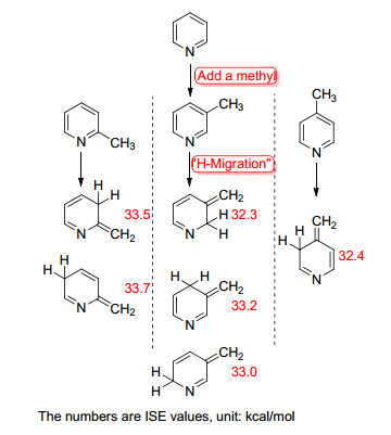 这种方法在加入甲基时有一定任意性, 并且H原子的“迁移”也因为芳香性化合物的共轭可以使sp3碳原子传导到环内多个位置.例如, Schleyer等[62]计算了吡啶的ASE (Scheme 5), 其建立甲基-亚甲基法模型时有多种情况, 一一列举并进行校正计算后, 发现去芳构化的结构比原本芳香结构的能量升高, 说明了芳香性提供了稳定化能.
