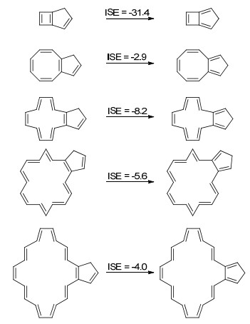 文中以[4n]轮烯为研究对象(Scheme 7), 也研究了该体系的芳香稳定化能.可以看出, 具有4n个π电子的轮烯结构, 除了环丁二烯是反芳香的, 其他分子都是接近非芳香性的.由于环系足够大, 这些分子可以通过结构的扭曲来破坏共平面性, 从而减少反芳香性导致的去稳定化作用[63].