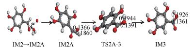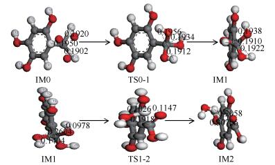 ln(k) /s-1IM0 -647.8643879 TS0-1 -647.6631287 -1381.09 -33.962 528.406 -183.711 IM1 -647.8773231 TS1-2 -647.8250685 -1574.66 -25.383 137.193 -25.889 IM2 -647.8869909 IM2A -646.7025609 TS2A-3 -646.6834768 -647.04 -2.402 50.103 9.245 IM3 -646.7034749 3.3 三个氢原子氧化反应路径图 14为分子C6H2(OH)3CH3甲基上的三个氢原子先被氧原子氧化成羟基,然后直接被氧化成羧基过程中键长的变化。由于出现三个氧原子这里对原子进行编号标记,记19、20、21为标记氧原子,15、17、18为标记氢原子。IM0中当O20靠近H17、O19靠近H15及O21靠近H18时,由于氧原子对氢原子产生的牵引作用使得H17与碳原子的距离由0.1950 nm拉伸到0.1956 nm时共价断裂,同时H18与碳原子的距离由0.1902 nm拉伸到0.1912 nm,H15与碳原子的距离由0.1920 nm拉伸到0.1934 nm共价键均断裂,氢原子与氧原子形成新的共价键。此时三个氧原子均与碳原子构成共价键。由于反应物结构内的甲基与氧原子通过较小的空间旋转便可以得到过渡态,所以虚频较小,此过程需克服14.372 kJ/mol的反应势垒,然后分子为趋于稳定结构,碳氧键的距离做了较小的调整得到IM1,整个反应放热量为2.774 kJ/mol。 随后这三个羟基容易去掉一个水分子形成羧基,由于三者性质相同故在此对羟基重新标记,将O17所在的羟基与O15连接的氢原子以一水分子的形式脱除。当IM1所对应的O17与碳原子的距离由0.1404 nm拉伸到0.1918 nm时共价键断裂,同时与O15相连的H21受到O17的牵引作用,其与O15的键距由0.0978 nm拉伸到0.1147 nm时共价键也断裂最终形成羧基,此过程需克服129.859 kJ/mol的反应势垒。然后分子为趋于稳定结构慢慢远离水分子得到IM2,总的反应放热量为62.560 kJ/mol。 表 3为三个氢原子氧化反应路径过程中的反应物、中间体、生成物及过渡态的总能量,过渡态的频率,基元反应的反应能量、反应势垒及反应速率常数。IM0表示初始反应物,IM1表示中间产物,IM2表示最终产物,TS0-1、TS1-2表示过渡态。图 15为三个氢原子氧化反应的反应势垒。  表 3