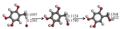 ln(k)/s-1IM0 -572.4485192 TS0-1 -572.4476524 -124.77 -452.010 2.276 28.539 IM1 -572.6206809 IM1A -572.6206558 TS1A-2 -572.4952856 -1526.41 -9.791 142.352 -27.970 IM2 -572.5993533 IM2A -646.7025609 TS2A-3 -646.6834768 -647.04 -2.402 50.103 9.245 IM3 -646.7034749 3.2 两个氢原子氧化反应路径图 11为分子C6H2(OH)3CH3甲基上的两个氢原子先被氧原子氧化成羟基后脱水形成醛基过程中键长的变化。由于出现两个氧原子这里对原子进行编号标记。从IM0看到13、14号氧原子分别靠近10号碳原子,当O14靠近C10时,其对H19产生的牵引作用使得H19与C10之间的碳氢键变长作用力减弱。当O14与H19距离由0.2036 nm缩小为0.1645 nm时,H19与C10间的共价键断裂,H19与O14形成共价键。同时O14与C10距离由0.1453 nm缩小到0.1253 nm时,O14与C10开始形成共价键。对于O13而言,当O13与C10、H17靠近过程中,O13与H17间距由0.0976 nm变为0.0981 nm形成共价键。同时O13与C10间距由0.1395 nm缩小为0.1326 nm也形成共价键,该过程共需克服528.406 kJ/mol的反应势垒,然后分子为达到稳定状态,这时O14与C10的键距伸长为0.1405 nm。同理O13与C10键距拉伸到0.1438 nm保持稳定并得到IM1,整个反应过程放热为33.962 kJ/mol。 当一个甲基上存在两个羟基时其稳定性变弱,两个羟基容易去掉一个水分子变成醛基。由于两个羟基的属性是相同的,故两个羟基去掉任何一个结果都一样。在此对两羟基重新标记,这里是去掉O17所在的羟基与H20。当IM1所对应的O17与H20相互吸引靠近,其距离从0.2330 nm减小到0.1279 nm时形成共价键,此时O17与C10的距离由0.1438 nm拉伸到0.1874 nm时共价键断裂。O18与H20的距离由0.0971 nm拉伸到共价键断裂,同时O18与C10的距离由0.1405 nm缩小到0.1321 nm时形成双键,该过程需克服137.193kJ/mol的反应势垒。随后小分子开始远离使整个系统处于稳定状态得到IM2,该反应放热25.383 kJ/mol的能量。 当醛基形成后,水分子由于分子力减弱而远离醛基,同时氧原子靠近醛基并发生氧化过程。图 12为IM2→IM2A(水分子远离醛基,氧原子靠近醛基并产生作用前的过渡过程)及醛基被氧化成羧基的过程中键长的变化。醛基被氧化成羧基的过程和单个氢原子反应路径中的醛基氧化过程相同。当醛基形成后,水分子由于分子力减弱远离醛基。单个氧原子靠近醛基上的氢原子并利用原子间的作用力使得碳氢键的长度由0.1860 nm不断拉大到断裂,同时氧原子让氢原子绕其转动形成共价键。当氧原子与碳原子距离由0.1366 nm拉大到0.1391 nm时两者间形成共价键。最后分子趋于稳定时碳氧键缓慢收缩到0.1361 nm,同时氢原子转动到原平面,此过程需克服50.103 kJ/mol的反应势垒,放热量2.402 kJ/mol。 表 2为两个氢原子氧化反应路径过程中的反应物、中间体、生成物及过渡态的总能量,过渡态的频率,基元反应的反应能量、反应势垒及反应速率常数。IM0表示初始反应物,IM1、IM2、IM2A表示中间产物,IM3表示最终产物,TS0-1、TS1-2、TS2A-3表示过渡态。图 13为两个氢原子氧化反应的各反应势垒。  表 2