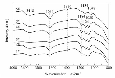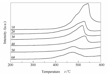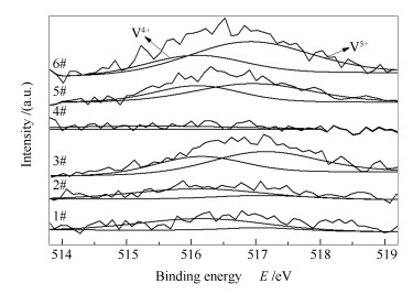 表 1 催化剂中各组分的含量 Table 1. Content of each component in the catalysts Catalyst Content w/% TiO2 V2O5 WO3 SiO2 Al2O3 BaO SO3 K2O Na2O Fe2O3 CaO 1# 80.75 0.56 4.61 3.95 3.13 2.51 1.71 0.18 0.08 0.76 1.55 2# 84.54 0.52 4.60 3.75 2.97 2.42 0.86 0.02 - 0.04 0.16 3# 83.58 1.07 5.06 3.75 2.95 2.41 0.85 0.02 - 0.04 0.15 4# 85.63 0.12 4.56 3.68 2.88 2.23 0.86 - - - - 5# 84.15 1.10 5.12 3.66 2.86 2.22 0.85 - - - - 6# 93.77 1.09 5.08 - - - 0.06 - - - - 表 2 催化剂的比表面积和孔结构 Table 2. Surface areas and pore structures of the catalysts Catalyst Surface area A/(m2·g-1) Pore volume v/(cm3·g-1) Average pore diameter d/nm 1# 43.7 0.24 22.0 2# 53.4 0.26 19.8 3# 53.4 0.17 12.4 4# 61.2 0.21 13.6 5# 55.8 0.20 13.6 6# 79.4 0.37 18.6 表 3 催化剂中V5+、V4+、Oα和Oβ的相对含量 Table 3. Relative contents of V5+, V4+, Oα and Oβ in the catalysts Catalyst Relative content/% V5+/(V5++V4+) V4+/(V5++V4+) Oα/(Oα+Oβ) Oβ/(Oα+Oβ) 1# 13.31 86.69 15.05 84.95 2# 22.51 77.49 25.34 74.66 3# 57.28 42.72 40.25 59.75 4# - - 28.77 71.23 5# 64.84 35.16 42.54 57.46 6# 66.00 34.00 47.38 52.62