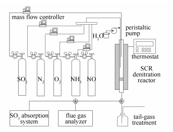 选择性催化还原(SCR)技术是目前最成熟的烟气脱硝技术, 广泛用于燃煤电站等固定源的氮氧化物(NOx)排放控制, 其核心是SCR催化剂[1]。目前, 商用SCR催化剂一般是以V2O5为活性组分、WO3(或MoO3)为催化助剂、TiO2为载体的V2O5-WO3(MoO3)/TiO2催化剂。在实际使用过程中, 催化剂因活性位点被覆盖、流失或发生不可逆的化学转化而逐渐失活[2], 导致催化效率明显下降, 同时SO2氧化率显著上升。当催化剂不能满足SCR系统整体脱硝性能要求时, 即需进行更换, 被换下的催化剂根据失活和破损程度, 进行再生或者废弃处理, 而催化剂不能无限制再生, 最终都要进行废弃处理。 针对废弃SCR催化剂, 有学者提出采用物化方法集中处理, 回收钒、钨和钛等元素, 然而, 回收工艺涉及多种元素的分离提纯, 技术路线长且复杂, 还会引发诸多环境问题[3-5]。也有学者借鉴催化剂再生技术的思路, 通过对废弃催化剂进行有毒物质的清理以及活性组分的负载等工艺, 实现废弃催化剂的循环再利用。Lee等[6]采用0.5 mol/L的H2SO4溶液对废弃催化剂进行清洗, 随后采用0.05 mol/L的偏钒酸铵溶液和0.05 mol/L的偏钨酸铵溶液的混合液进行活性组分负载, 使催化剂的脱硝效率由处理前的45%提升至95%, 处理后催化剂表面绝大部分的有毒物质得以清除, 同时, SO42-的引入还增加了催化剂表面酸位点的数量和强度。史伟伟等[7]先用去离子水对废弃催化剂进行清洗, 随后进行活性组分浸渍, 发现当钒的再负载量达0.5%(质量分数)时, 可使脱硝效率由69.71%恢复至98.59%, 但SO2氧化率高达0.96%;为此尝试向催化剂中掺杂金属元素以控制SO2氧化率, 结果表明, 金属元素的掺杂能在一定程度内降低SO2氧化率, 但脱硝效率也随之降低。刘建华等[8]采用0.005 mol/L的H2SO4溶液对废弃催化剂进行处理, 随后进行活性组分负载, 结果表明, 催化活性有所恢复, 但SO2氧化率却由处理前的1.08%升高至1.18%。针对废弃催化剂的循环利用, 现有学者多将研究重点集中于催化活性的恢复上, 而忽略了SO2氧化率的控制问题, 而且仅有的少数研究也都表明处理后所得催化剂的SO2氧化率明显偏高。SO2氧化率是SCR催化剂的一项重要指标, 直接决定了SO3与硫酸铵盐的生成, 从而直接影响了催化剂硫中毒、空预器堵塞和设备腐蚀等问题[9]。 基于此, 本研究提出了一种新型的废弃催化剂再利用方法, 包括酸洗、还原酸浸以及活性组分负载等主要步骤, 在恢复催化剂脱硝效率的同时, 有效控制SO2氧化率。重点测试了再利用过程中不同的处理步骤对催化剂脱硝效率和SO2氧化率的影响, 并采用X射线荧光光谱分析(XRF)、物理吸附、X射线衍射(XRD)、氨气程序升温脱附(NH3-TPD)、氢气程序升温还原(H2-TPR)、X射线光电子能谱(XPS)和傅里叶变换红外光谱(FT-IR)等分析手段对催化剂进行表征。 1 实验部分1.1 废弃及新鲜催化剂试样实验所采用的废弃蜂窝V2O5-WO3/TiO2催化剂取自中国某电厂, 照片见图 1。实验前先进行分拣, 选择结构较为完整的催化剂模块, 切割出高50 mm的3×3孔催化剂块体备用。 实验中新鲜催化剂采用等体积浸渍法制备, 具体方法如下:将适量的偏钒酸铵和偏钨酸铵分别配制成相应的盐溶液, 配制时向偏钒酸铵溶液中滴加适量的单乙醇胺以加速其溶解。然后将上述盐溶液依次加入到锐钛矿型纳米TiO2中, 搅拌均匀后超声震荡3 h, 并在室温下陈化24 h, 然后依次在110 ℃下干燥8 h, 550 ℃下焙烧3 h后获得新鲜催化剂。 1.2 废弃催化剂再利用技术1.2.1 废弃催化剂常规再利用技术针对上述废弃催化剂(记为1#), 按照如下方法进行常规再利用处理。首先进行物理除灰, 随后用去离子水在45 ℃下超声震荡清洗30 min, 然后用足量的0.5 mol/L的H2SO4溶液超声震荡清洗15 min, 最后在110 ℃下干燥8 h, 干燥后研磨筛分为100-200目的催化剂粉末(记为2#)。针对2#催化剂, 采用等体积浸渍法进行活性组分负载, 将适量的偏钒酸铵和偏钨酸铵分别配制成相应的盐溶液, 然后依次加入到2#催化剂粉末中, 搅拌均匀后超声震荡3 h, 并在室温下陈化24 h, 然后依次在110 ℃下干燥8 h, 400 ℃下焙烧3 h, 获得常规再利用催化剂(记为3#)。 1.2.2 废弃催化剂新型再利用技术在上述常规处理技术的基础上, 本研究提出在酸洗之后采用还原酸浸法对废弃催化剂进行处理, 随后再进行活性组分再负载, 具体操作步骤如下。在搅拌条件下, 将适量质量浓度为98%的乙二醇和前述2#催化剂粉末(乙二醇与2#催化剂中活性组分五氧化二钒的物质的量比在5 :1-10 :1)加入到2 mol/L的H2SO4溶液中, 在95 ℃下还原酸浸处理4 h, 随后进行抽滤并用去离子水将滤渣漂洗至pH值为7, 最后在110 ℃下干燥8 h, 干燥后研磨筛分为100-200目的催化剂粉末(记为4#)。对4#催化剂进行活性组分负载, 方法同上, 由此获得再利用催化剂(记为5#)。此外, 将新鲜催化剂记为6#, 该新鲜催化剂中的V2O5和WO3的质量分数与3#和5#催化剂相当。 1.3 催化剂性能评价催化剂的性能评价主要包括脱硝效率和SO2氧化率测试, 两者均在常压连续流动固定床石英管(内径为8 mm)反应器中进行。实验装置示意图见图 2, 主要由钢瓶气源、质量流量计、混气罐、SCR脱硝反应器、尾气处理系统、移动式全红外烟气分析仪、温控系统和给水系统组成。此外, 在测试SO2氧化率时还需在反应器入口和出口加装相应的SO3吸收装置。 实验时, 催化剂置于脱硝反应器中, 反应所需的模拟烟气由NO、NH3、SO2、O2、水蒸气