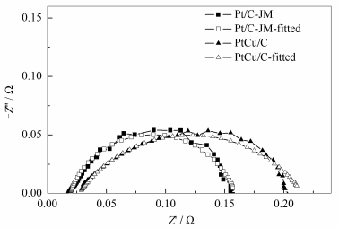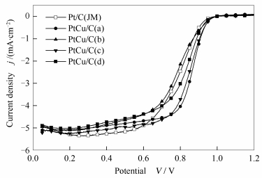 Table 1. Mean particle sizes calculated from TEM and XRD results1.2 催化剂的结构表征采用X射线衍射(XRD) 和透射电子显微镜(TEM) 对催化剂进行结构、形貌表征。XRD测试表征催化剂的晶相结构,所用仪器为德国布鲁克公司D8 ADVANCE型X射线衍射仪,使用Cu Kα射线源,工作电压为40 kV,工作电流为40 mA,10°-90°扫描,扫描速率为6(°)/min。TEM考察催化剂金属颗粒的粒径和分散情况。所用仪器为日本电子光学公司的JEM-2010透射电子显微镜。加速电压为200 kV,采用铜网微栅样品架,样品在无水乙醇中超声分散,然后负载到样品架上制成电镜样品。 1.3 催化剂的电化学表征采用循环伏安法(CV) 和线性扫描伏安法(LSV) 对催化剂进行了电化学性能测试。测试仪器为上海辰华公司的CHI104P电化学工作站及美国PINE公司的AFMS-LXF型旋转圆盘电极。测试采用常规三电极体系的电解池。涂覆有催化剂的旋转圆盘电极为工作电极,可逆氢电极(RHE) 为参比电极[27, 28],铂丝为对电极。0.1 mol/L HClO4溶液为电解液,测试温度为室温(25 ℃)。 工作电极制备:称取2.0 mg催化剂,加入1 mL的5% Nafion与甲醇(质量比为1:30) 混合溶液超声30 min使催化剂分散均匀,用微量进样器抽取混合液10 μL,滴加到旋转圆盘电极表面,干燥后进行测试。 CV测试:电压扫描为0.05-1.15 V (vs. RHE),扫描速率为50 mV/s。测试前,在电解液中通N2 30 min排出其中的O2。根据CV曲线计算电化学活性面积(ECSA)。 LSV测试:电压扫描为0.05-1.2 V (vs. RHE),扫描速率为5 mV/s,转速为1 600 r/min。测试前,在电解液中通O2 30 min使其中的O2饱和。根据LSV曲线算出质量比活性(MA)。 1.4 催化剂的性能表征1.4.1 膜电极制备研究所采用的膜电极(MEA) 采用CCM (catalyst-coated membrane) 法制备。将催化剂、高纯水、5% Nafion溶液和异丙醇按一定比例混合,冰水浴中超声振荡3 h。将形成的催化剂墨水浆料均匀地喷涂到Nafion膜上, 将碳纸覆盖于喷涂好催化剂的Nafion膜两侧。然后在130 ℃、0.3 MPa条件下热压120 s,利用绝缘胶带将碳纸和Nafion膜的边缘处密封覆盖,得到单电池测试所需的MEA。制得MEA面积为5 cm2,阴极催化剂采用自制PtCu/C催化剂,Pt载量为0.4 mg/cm2,阳极采用Pt/C-JM催化剂,Pt载量为0.2 mg/cm2。同时,制备一个阴阳极均为Pt/C-JM催化剂的MEA作为对比,阴阳极Pt载量与上述MEA相同。 1.4.2 单电池测试将制备好的MEA组装到自组装燃料电池测试平台上。MEA两侧采用聚四氟乙烯薄膜防止电极两端短路,测试采用石墨双极板,蛇形流道。测试时先将电流密度逐步加载到500 mA/cm2对单电池进行活化,直至单电池性能不再上升。测试时,首先将电池调到开路状态,测试开路电压。然后连接负载,测试并绘制极化曲线。 电化学交流阻抗谱(EIS) 测试使用美国GAMRY公司的Reference 3000型号电化学工作站,电池工作电流为1 A,扫描频率为0.1-10 kHz,扰动电流为200 mA。 原位循环伏安(In-situ CV) 测试同样使用美国GAMRY公司的Reference 3000型号电化学工作站,采用三电极体系,阴极为工作电极,阳极为对电极及参比电极,0.05-1.15 V (vs.RHE) 扫描,扫描速率为20 mV/s。测试前先将阴极进气由空气换为N2对电池进行吹扫使电池开路电压降至0.15 V以下。 2 结果与讨论2.1 TEM测试图 1为不同金属前驱体制备的PtCu/C催化剂的TEM照片和颗粒粒径分布。由1中TEM照片可知,金属颗粒成功负载在碳载体上,且分布较为均匀,粒径较小。统计每幅TEM照片中超过100个金属颗粒的粒径,计算得出四种催化剂金属颗粒的平均粒径依次为2.3、4.1、3.4、4.8 nm,商业Pt/C-JM催化剂的金属颗粒平均粒径为3.0 nm。其中,a样品的金属颗粒在载体上分散均匀,粒径最小且粒径分布范围最窄,d样品中的金属颗粒发生团聚现象且粒径分布范围宽,即采用CuSO4和K2PtCl4作为前驱体时,制得的催化剂分散更为均匀,不易团聚,而CuCl2和K2PtCl4的前驱体组合易造成金属颗粒的团聚。采用CuSO4作为Cu的前驱体相较于CuCl2更易得到分散均匀、颗粒粒径小的催化剂,Cu前驱体中的氯离子不利于制备过程中活性组分的分散,这与已有的研究结果相符[29]。Shiflett等[30]在制备Ru催化剂时,通过实验和理论计算证实Cl-会吸附在催化剂活性组分或载体表面,进而影响其表观活化能,影响催化剂的均匀负载和分散。王桂英等[31]在制备Au/ZnO催化剂时也发现,Cl-会促进Au纳米颗粒的聚集,导致活性组分负载不均匀,催化剂团聚等问题。而K2PtCl4作为Pt的前驱体优于H2PtCl6是因为K2PtCl4更有利于保持金属颗粒形貌的稳定。 Kristian等[32]在制备PtCo/C催化剂时提出,在制备铂基合金或核壳结构催化剂过程中,比Pt活泼的金属在溶液中容易和铂盐发生置换反应。在研究的制备过程中,含有Pt4+的前驱体(H2PtCl6) 发生置换反应时,是两个Cu原子置换一个Pt4+,不利于纳米颗粒的稳定;而K2PtCl4中Pt为+2价,发生置换反应时,是一个Cu原子置换一个Pt2+,对纳米颗粒形貌的不利影响较小。 2.2 XRD表征对不同前驱体制备的PtCu/C催化剂进行XRD表征,结果见图 2。四种前驱体组合制得的PtCu/C催化剂的XRD谱图中都出现了对应Pt的面心立方晶格(fcc) 的四个衍射峰,分别对应于Pt晶体的(111)、(200)、(220)、(300) 晶面。但PtCu/C催化剂中的上述四个峰位置相对于Pt的标准衍射峰均有一定的右移,这是由于原子半径较小的Cu原子掺杂进入Pt的晶格,导致Pt-Pt间距减小,即Pt晶格收缩[33],这将有利于O2分子的吸附、解离。XRD谱图中衍射角2θ在25°附近的峰为载体XC-72碳C (002) 的衍射峰。在XRD谱图汇总没有观测到明显的Cu的衍射峰,说
